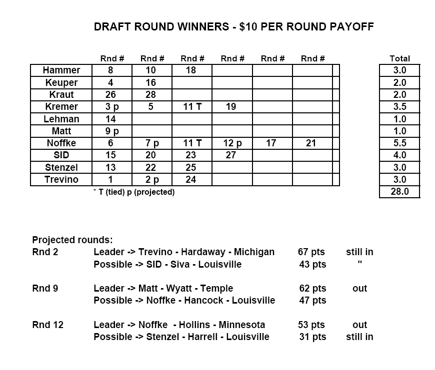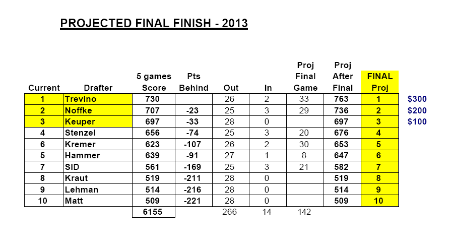 Through 5th round games - top 4 drafters (1-3 pay): 1st: Ralph,Nick & Sam Trevino - 730 2nd: Mark & Steve Noffke & Bruce Martin - 707 3rd: Kevin Keuper & Dave Eccles - 697 4th: Rob Stenzel & Jason Schladenhauffen - 656 Projected Final Results: