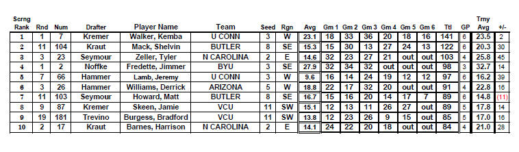 Kemba Walker (U Conn) totaled 141 points in the tournament this year. These were the most points scored by a tournament player since Juan Dixon (Maryland) in 2002 when Dixon scored 155 points in the NCAA's. The all time tournament record is by Glen Rice (Michigan) who in 1989 scored 184 points over 6 games for a 30.7 pts per game average. Walker's output provided Ken Kremer, who drafted him, an additional $25 bonus in addition to the $10 he won for winning the draft round Top 10 scorers from the tournament were as follows......Matt Howard was the only player who underperformed in the tournament <11> while Tyler Zeller provided Seymour +45 more points than expected.