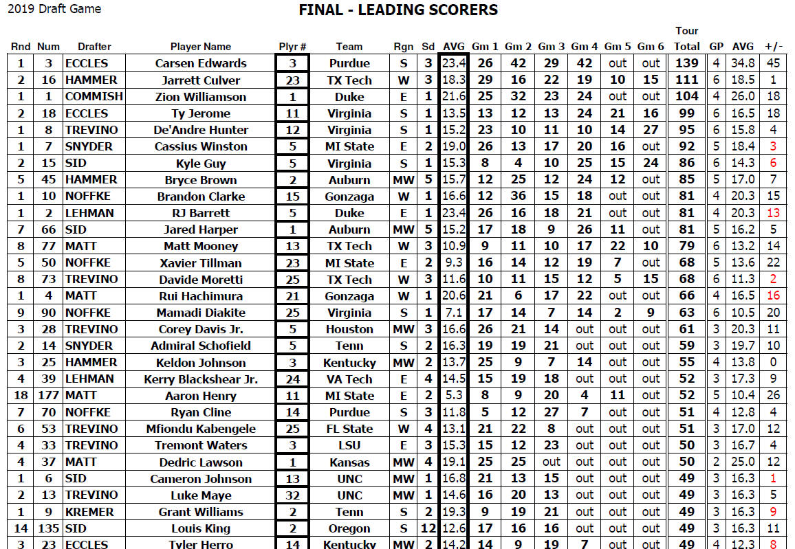 Finishing 2nd in scoring this tournament was Jarred Culver of Texas Tech drafted 16th (2nd round) by Dennis Hammer. The all time tournament scoring record is held by Glen Rice (Michigan) who in 1989 scored 184 points over 6 games, for a 30.7 pts per game average.