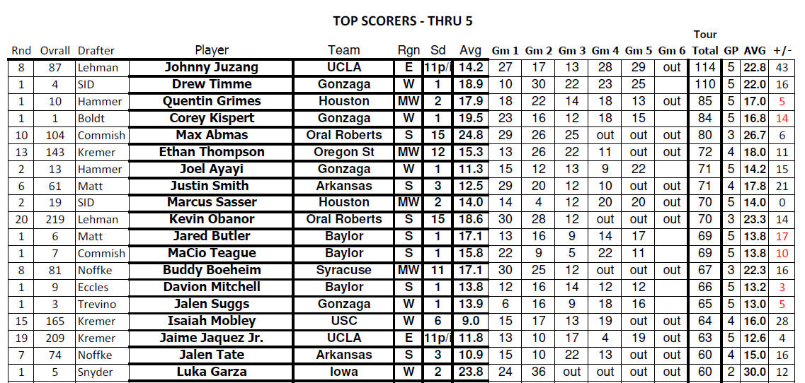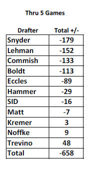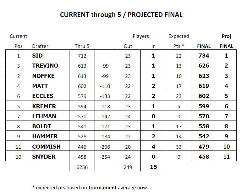 Through 5th round games - top 4 drafters (1-3 pay): 1st: Team SID - 712 2nd (tie): Team Trevino (Ralph, Nick & Sam) - 613 3rd (tie) : Team Noffke (Mark & Steve, Bruce Martin) - 613 4th: Matt Krautstrunk - 602
