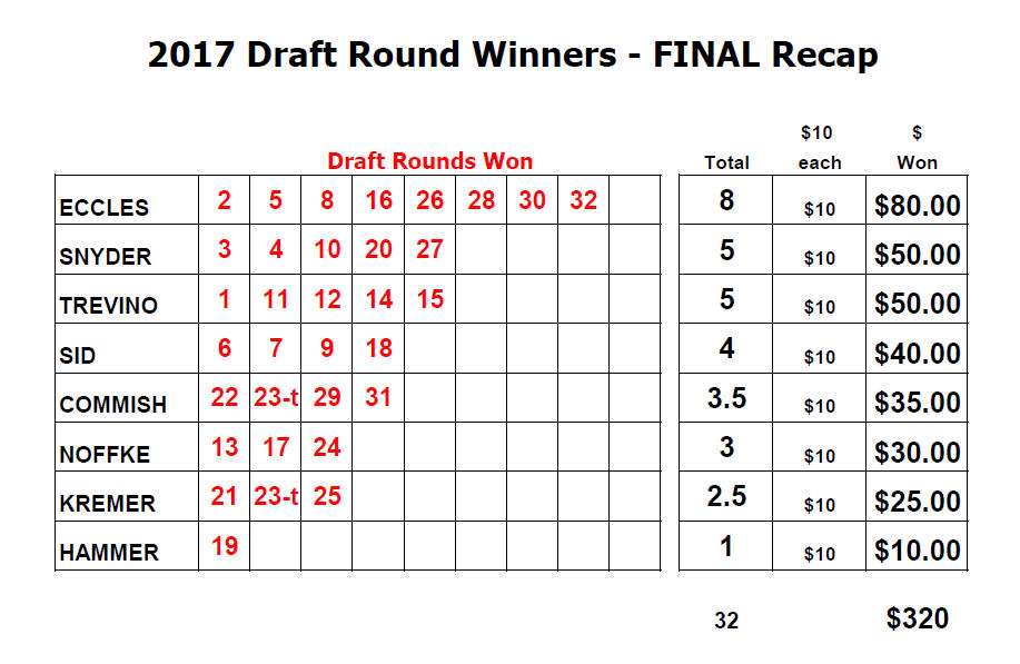 in 2017 with 32 draft rounds to pay out. Dave Eccles won 25% of