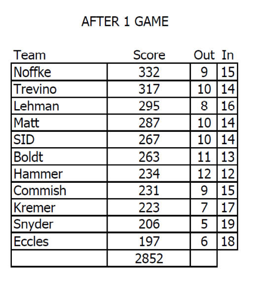 first game played, Team Noffke has a narrow 15 point lead over Team